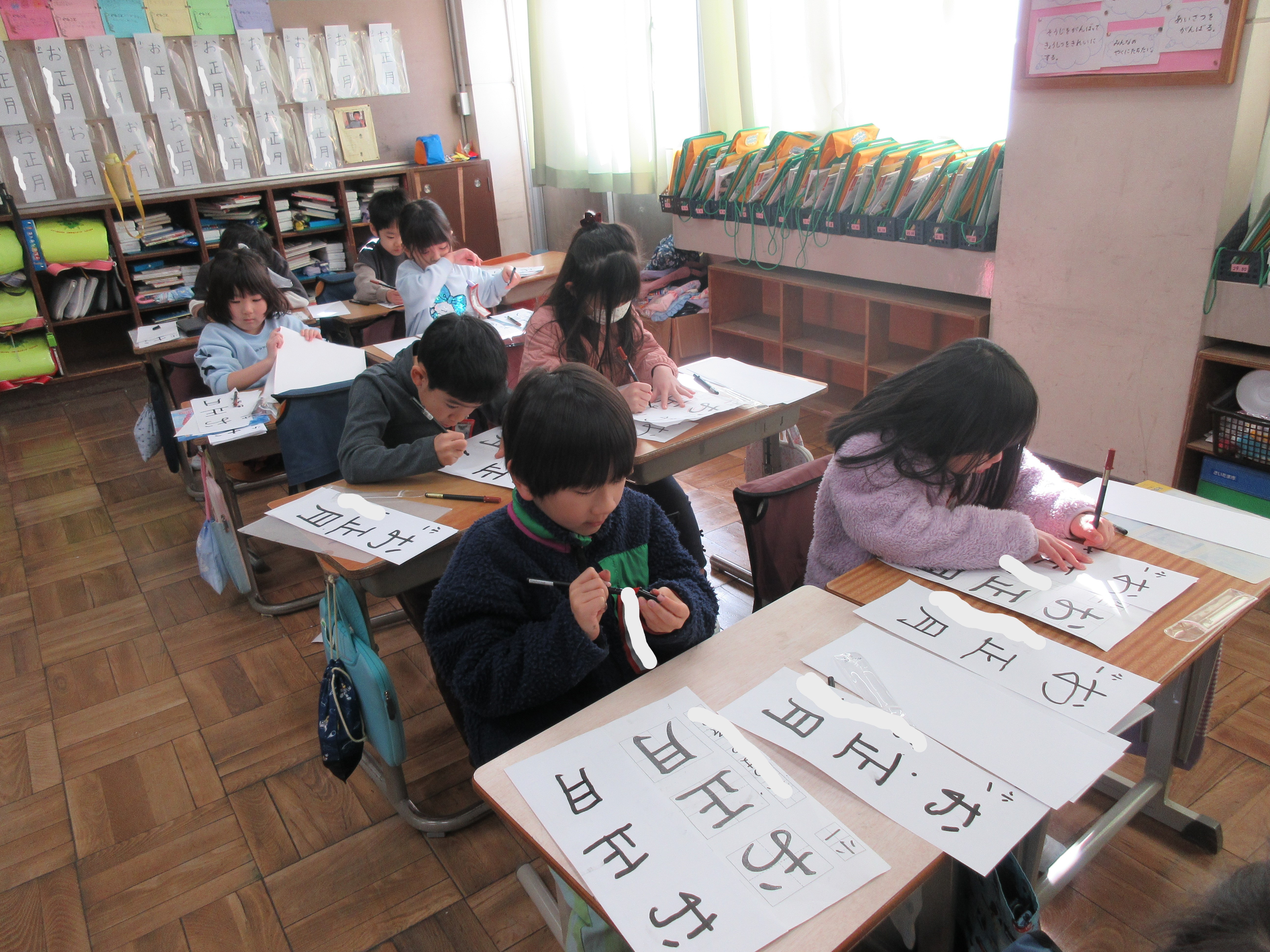 1月には、書きぞめ清書会、お話し会などの行事がありました。また、行事だけではなく、冬探しをしたり、風輪や風車を作って遊んだりするなど、普段の授業でも冬ならではの活動を行いました。