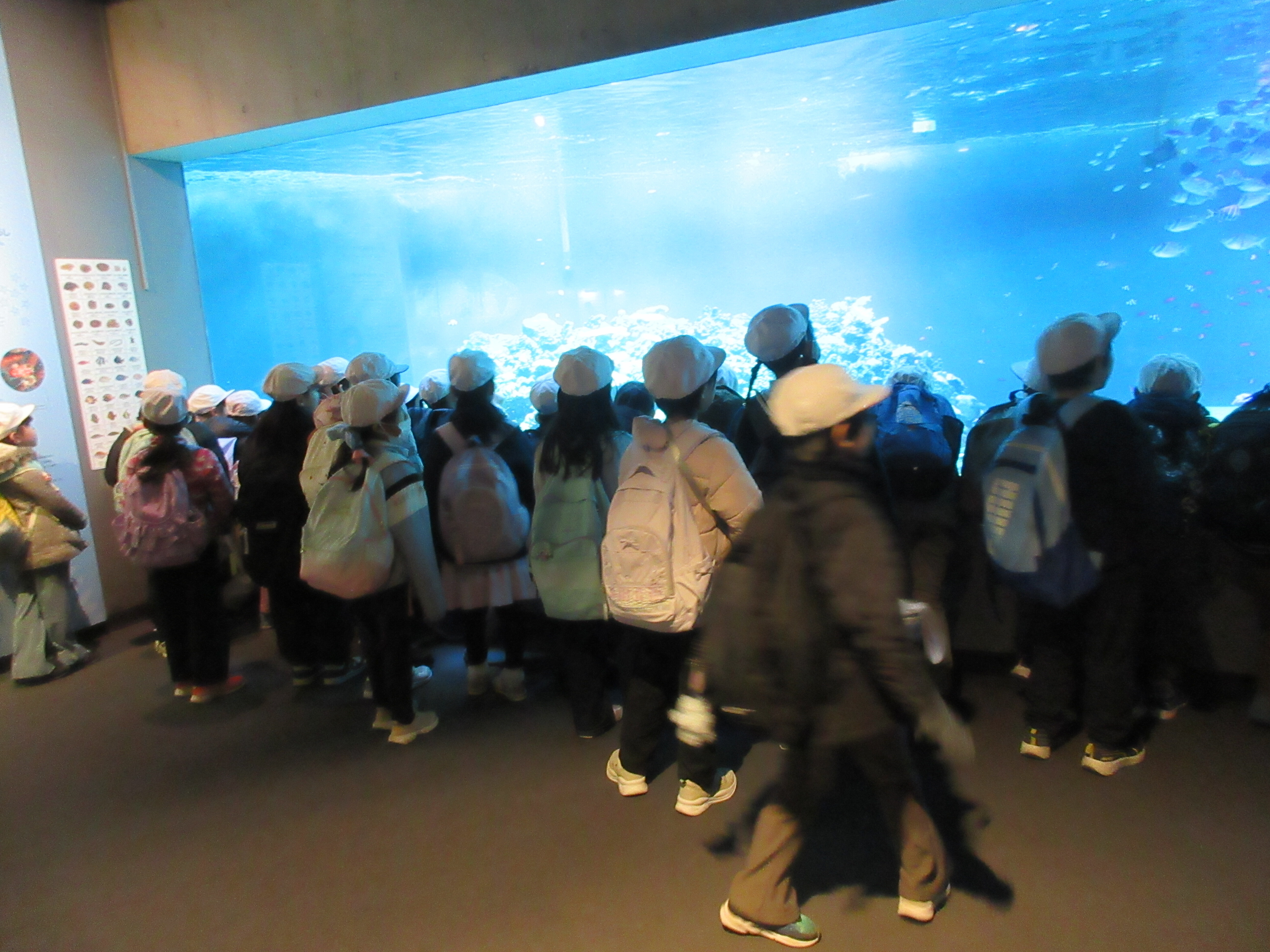 大きな水槽を泳ぐたくさんの魚や、大きなクロマグロの群れに目を輝かせ、友達と楽しそうに観察していました。