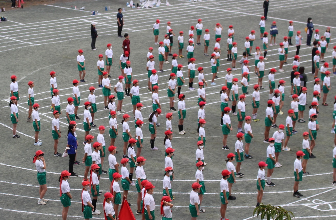 開会式、閉会式の流れを中心に、運動会の全体練習を全校で行いました。